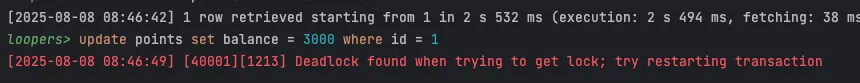| 6 | update points set balance = 3000 where id = 1; | dead lock → Tx2 rollback |