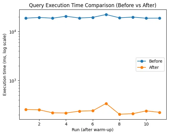 - 총 실행 비용 246.0에서 40.6로 감소 (약 83% 개선, 6배 성능 향상)