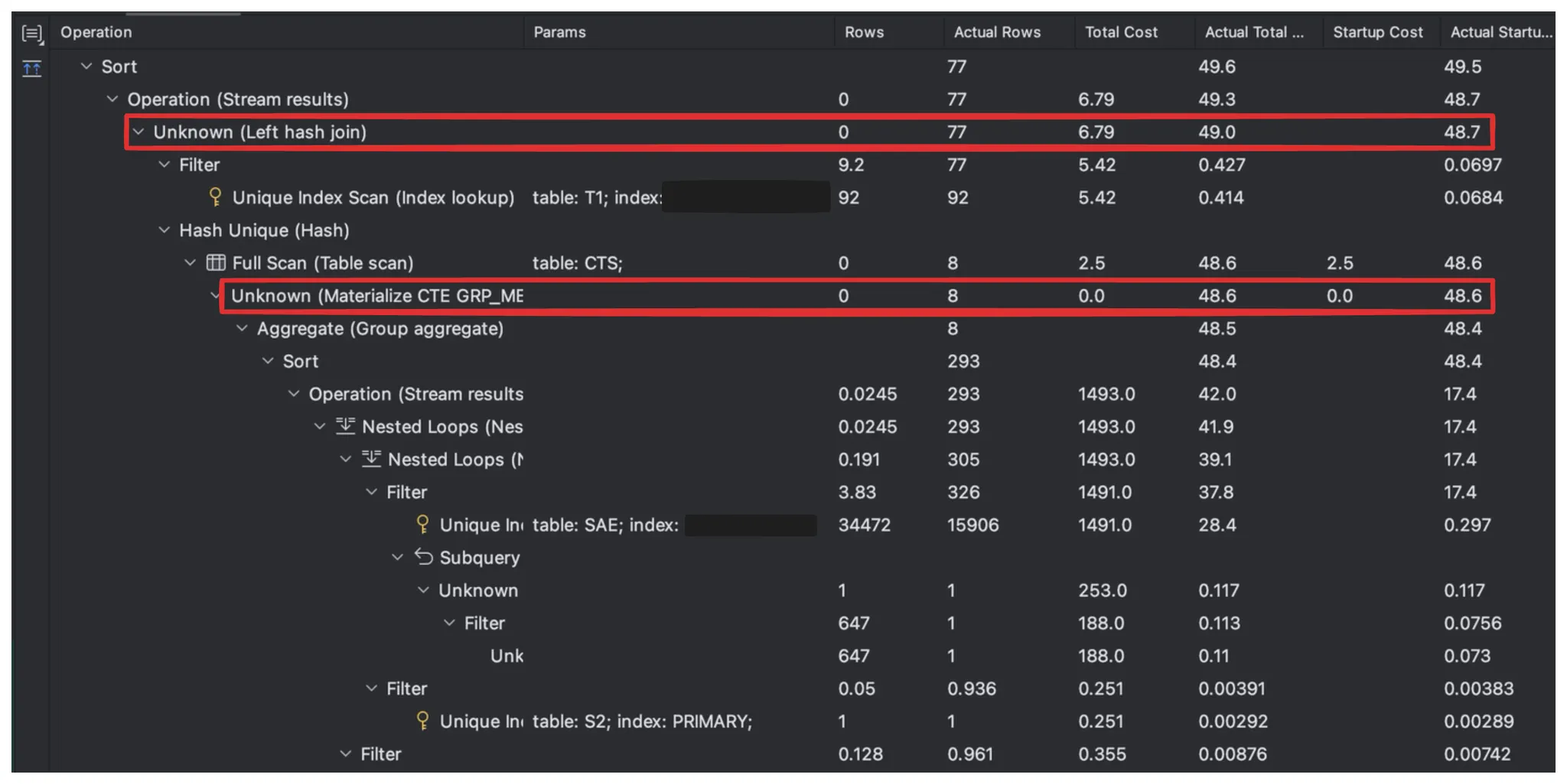 더 명확한 원인을 파악하기 위해 실행 계획을 분석했다. 덤프 DB에서 특정 성능 이슈가 보고된 테넌트를 기준으로 실행했다. 분석 결과는 다음과 같다: