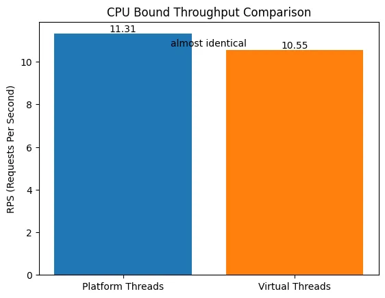 CPU-bound 시나리오에서는 두 스레드 모델 간 처리량 차이가 어의 없었으며, 가상 스레드 환경에서는 오히려 소폭 낮은 처리량이 관측되었다. 이는 CPU 연산량에 크게 의존하고 있음을 나타낸다.
