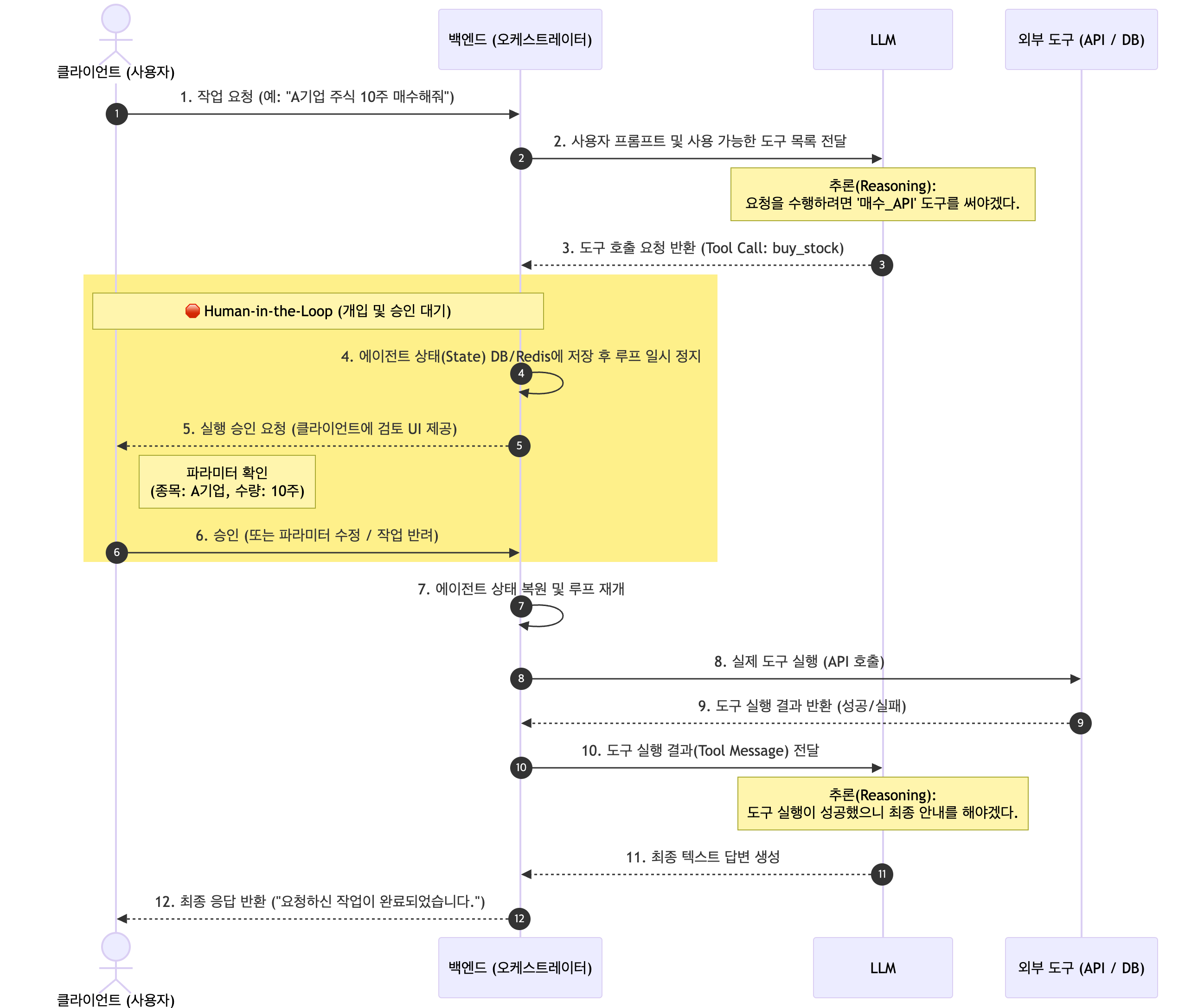 작업이 완료되거나 인간 개입(human in the loop) 패턴 혹은 사람의 확인이 필요한 경우, 특정 채널에 알림을 보내는 도구도 등록할 수 있다. 아래는 특정 기업의 주식을 매수하라는 클라이언트의 요청이 왔을 때 어떻게 도구가 선택될 수 있는지, 그리고 컨텍스트가 어떻게 유지되어야 하는지를 내가 개발하려는 프로젝트에 어떻게 적용할 수 있을지 아이디어를 시퀀스 다이어그램으로 표현했다.