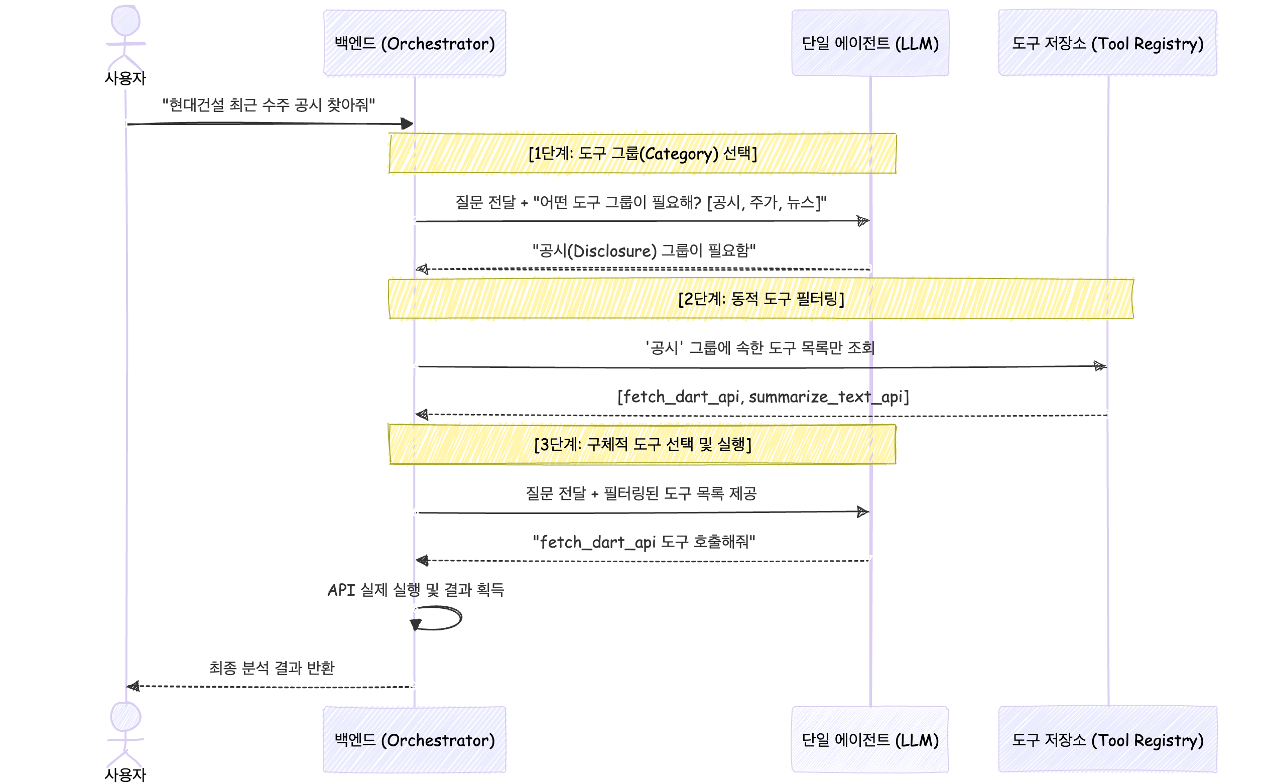 이를 해결하기 위한 방법으로 계층적 도구 선택 방식을 사용한다. 도구들을 그룹화해서 단계적으로 도구 그룹 → 도구 선택의 과정을 에이전트를 통해 거치면 되기 때문에 자연어를 이해할 수 있게 된다. 아래는 그 과정을 이해하기 쉽게 시퀀스 다이어그램으로 표현해 보았다.