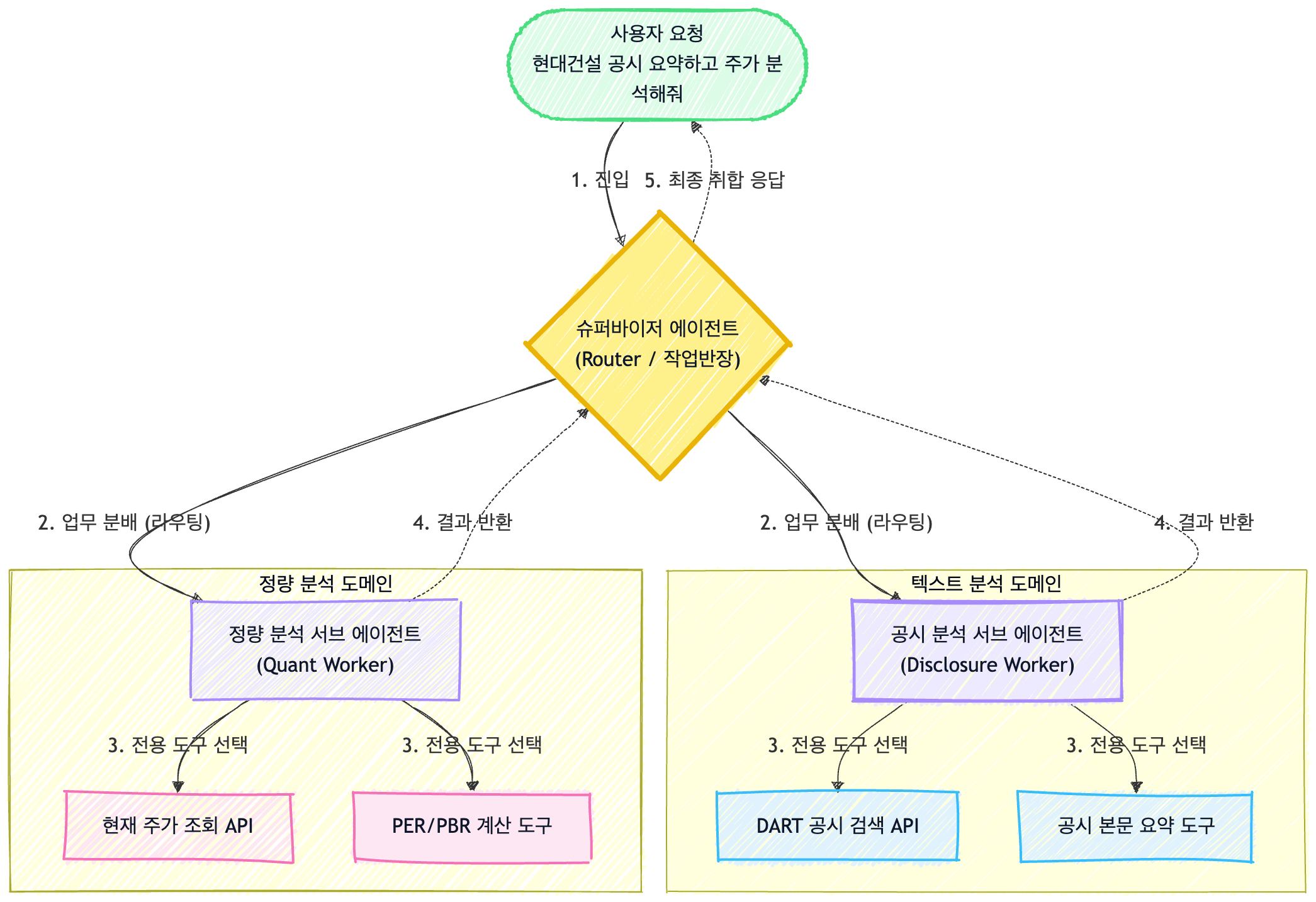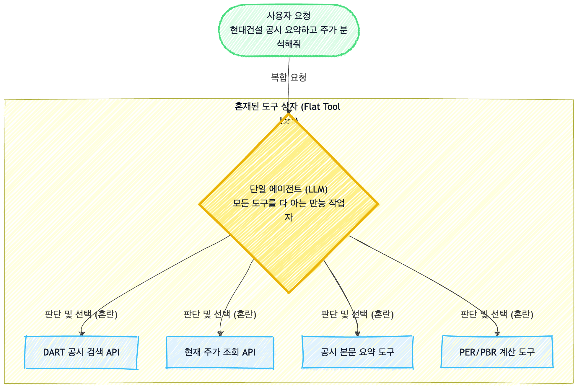 시맨틱 도구 선택 방식이 충분하지 않은 경우가 있다. 시맨틱 도구 선택 방식은 근본적으로 텍스트를 벡터(숫자 좌표)로 변환하여 두 점 사이의 수학적 거리(Consine Similarity)를 재는 기술이기 때문이다. 예를 들어, "현대건설 주가는 볼 필요 없고, 최근 유상증자 관련 DART 공시만 분석해 줘"라는 요청을 했을 때, 백터 임베딩 모델은 이 문장에서 주가, 분석이라는 키워드의 가중치를 높게 잡아 주가 조회 도구와 공시 조회 도구를 호출해서 분석하게 될 수 있다. 결과적으로 주가는 볼 필요 없다는 의도를 제대로 이해하지 못하는 이슈가 발생한다.