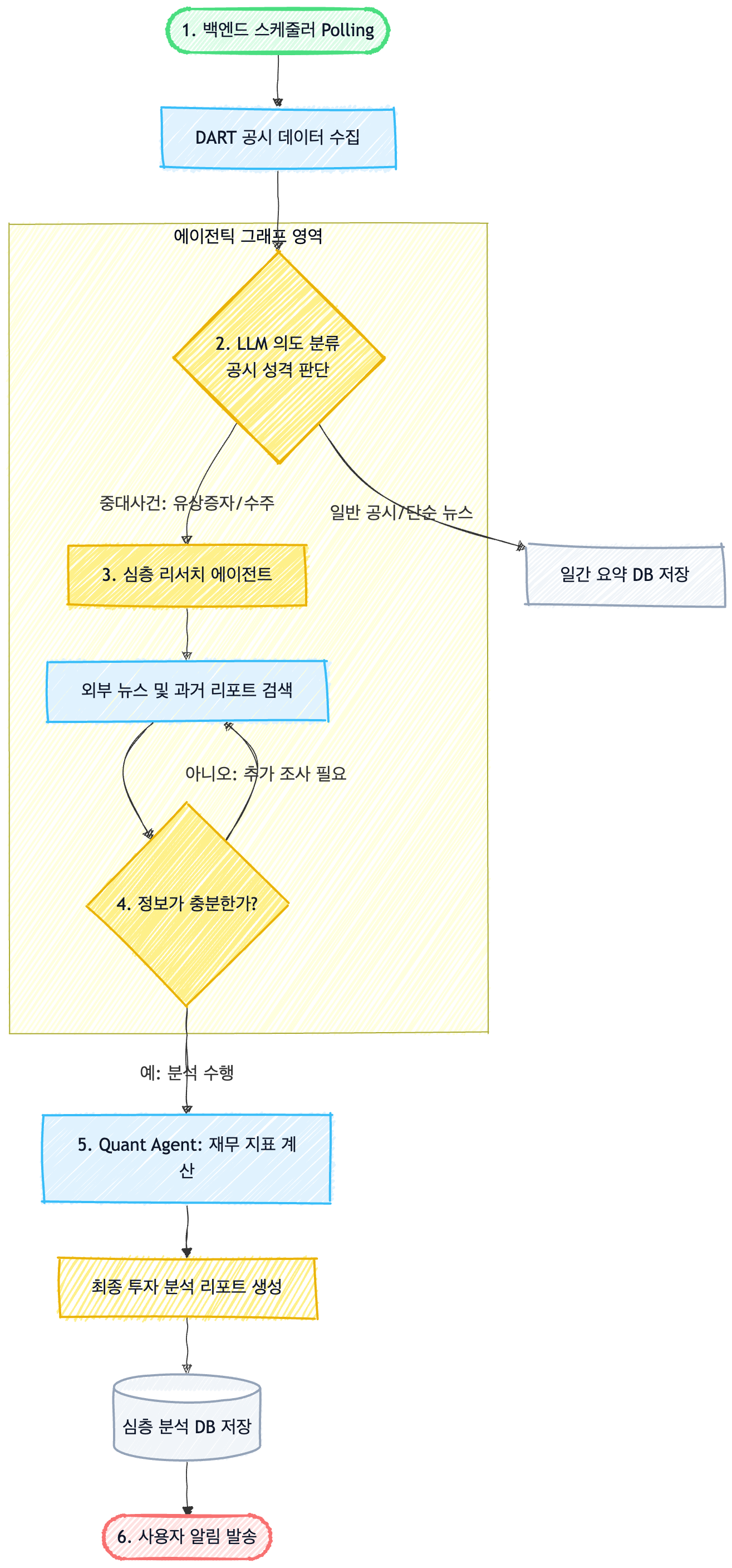 결국 LLM이 참여하여 동적으로 이 공시 데이터를 더 분석하면 좋을지 결정되는 분기문과 정보의 적절성을 판단하는 과정들이 들어가 있기 때문에 그래프 토폴로지로 생각해 볼 수 있었다. 아래는 그러한 과정을 그려보았다.