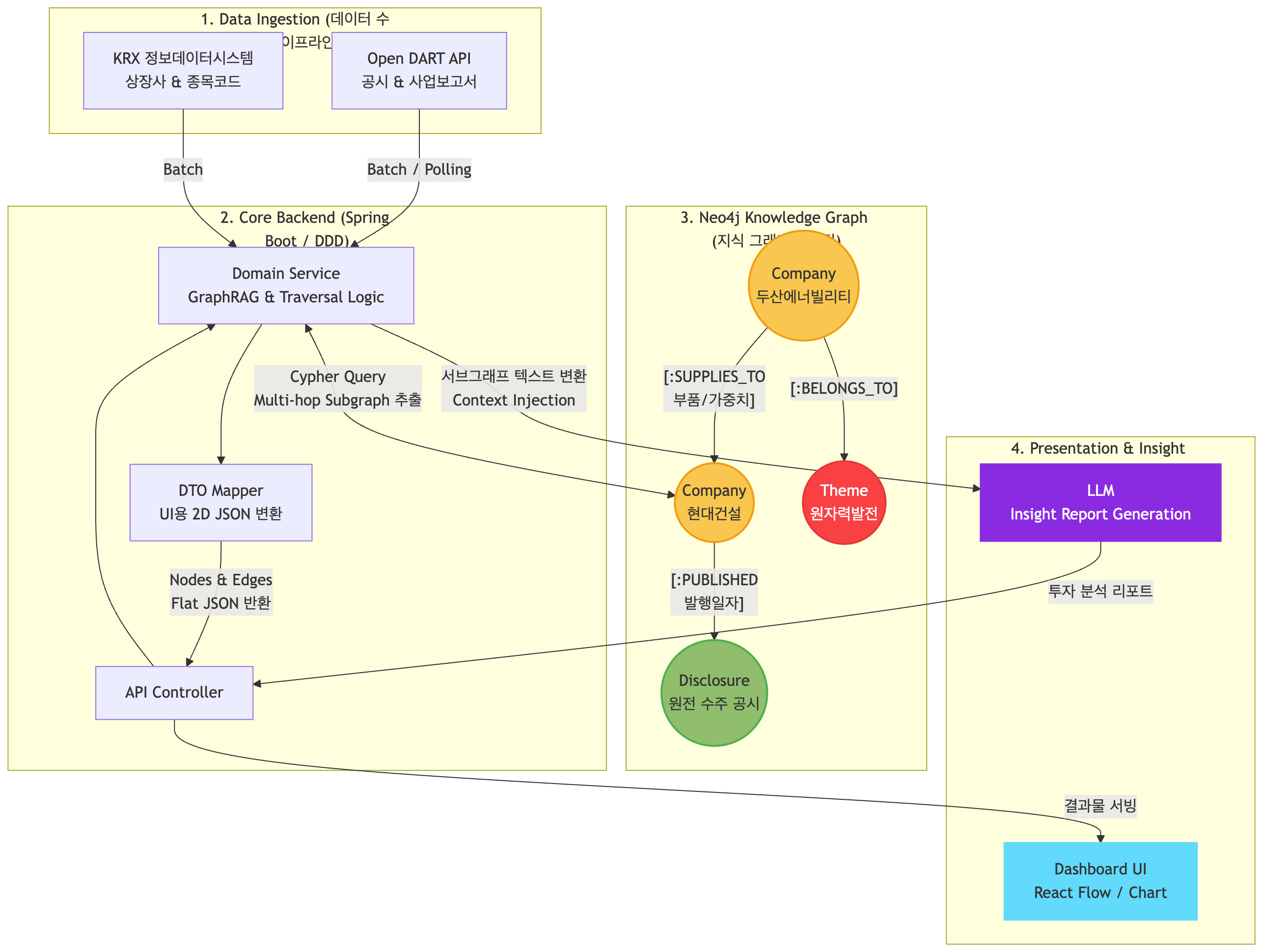아이디어 자체는 심플하다. 기업과 기업 간의 관계 그리고 산업 섹터의 그룹화를 그래프 DB 화하고 싶었다. 최근 전자공시 관련 책을 읽으면서 업스트림과 다운스트림 개념에 대해 알게 되었다. 예를 들어, 현대건설 측에서 원전 수주 공시라는 이벤트가 발생했을 때 현대건설의 업스트림기업과 다운스트림 기업을 알게 된다면 산업의 방향과 돈의 흐름을 빠르게 캐치할 수 있다는 것 아닐까?