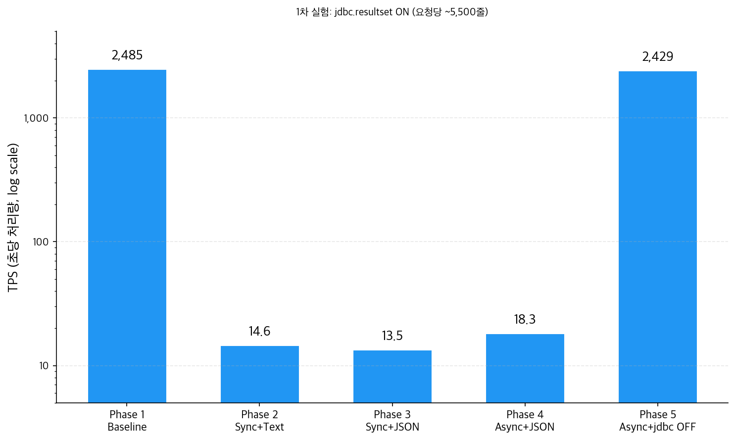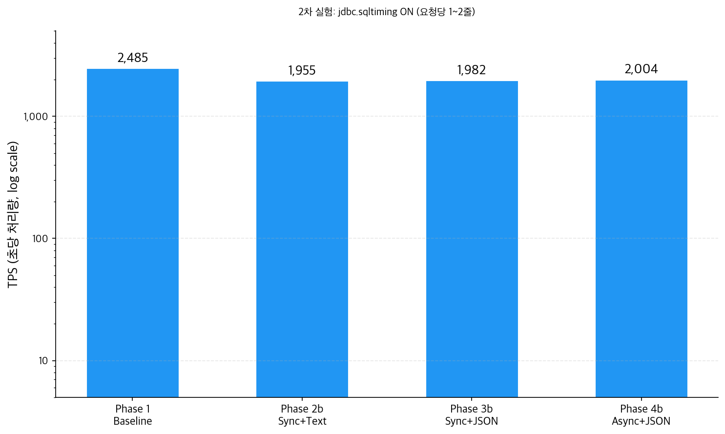 jdbc.resultset을 OFF 한 Phase 5에서 TPS가 2,429로 Baseline대비 97.7%까지 회복했다. 위 실험 결과를 바탕으로 로그량이 지배적인 요소임을 확인할 수 있었는데, Text를 JSON으로 동기를 비동기로 변환했을때의 차이점을 분명히 확인하기 어려워 추가적인 실험을 진행했다. 지금 Phase 2, 3, 4는 그 값이 너무 낮아서 서로간의 차이를 명확히 확인하기 어려운 점이 한계점이었다.