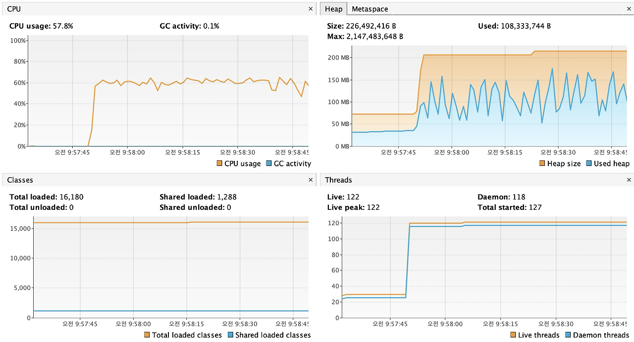 가장 주목할 점은 GC활동이 예상과 다르게 매우 낮다는 점이다. 따라서, 낮은 성능의 원인은 빈번한 GC가 아님을 확인할 수 있었다.